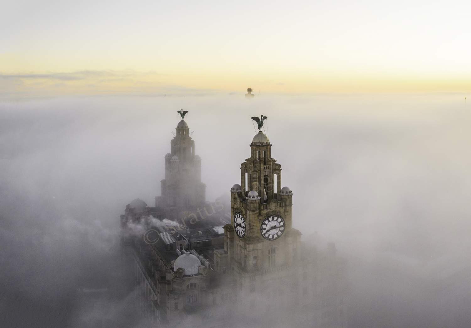 Photo of Liver Building shrouded in fog.