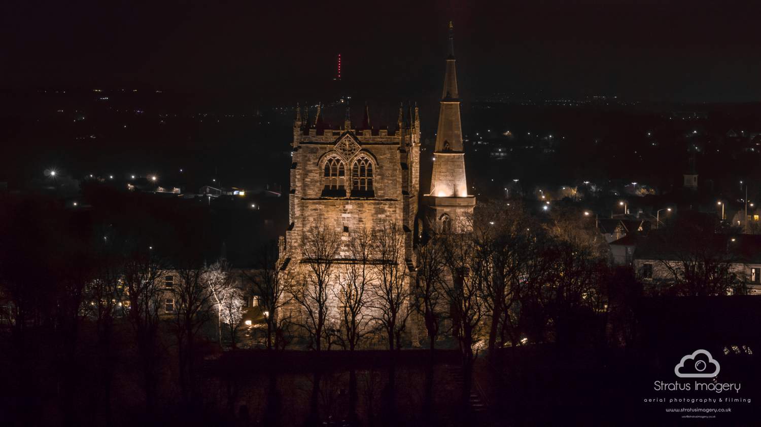 Night time aerial image of Ormskirk Parish Church image 2 Image size may differ due to sizes but church will be central